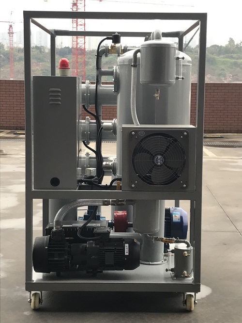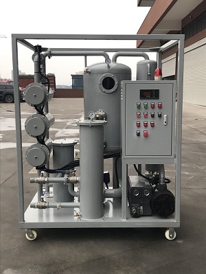 液压油过滤机工作时,污染油液在外界大气压真空吸进的作用下经入口进入加热器,加热后的油液进入初滤器,大颗粒杂质被滤除,然后油液进入分水器真空分离器,流过特制发散装置。该发散装置使单位体积的油液产生巨大的表面面积,让污染油液曝露于相对湿度很低的真空中,从而清除油中的水、空气和气体。蒸发的水蒸汽、气体所形成的混合气体通过水箱和冷却器冷凝成液体,一同进入储水器,剩余的气体被真空泵抽出。除去水分的油液被排油泵输入精滤器除去微粒杂质,即为净化油,完成一个净化过程,根据含水量的多少,须多次循环才能完全除去水分。
