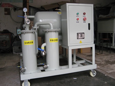 聚结分离式滤油机,以滤油机为代表,其原理是采用聚结、分离式滤芯吸除水份,采用精过滤芯去除杂质,这种滤油设备去除杂质性能较好,去除油中的大量水分效果也不错,缺点是耗材使用量大,一套滤芯更换下来得上万,同时去除油中水分的效果只能达到合格的边缘。滤油效果受油质的温度影响较大。